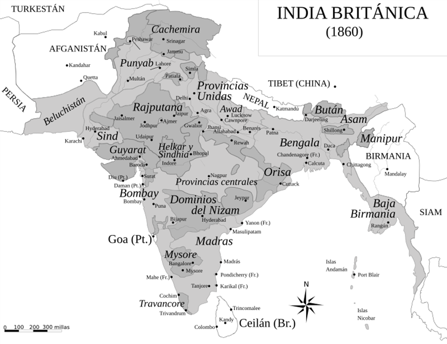 Mapa de la India Británica en 1909, abarcando los actuales territorios de India, Pakistán y Bangladesh.