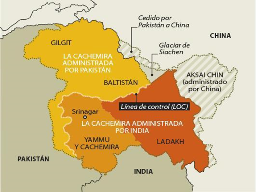 Mapa de la región de Cachemira, con la triple administración sino-india-pakistaní.