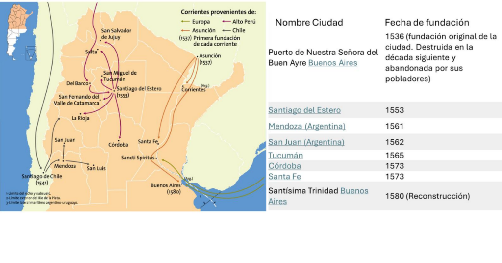 Para entender el posicionamiento de una parte de la sociedad argentina respecto al rol geopolítico que ocupa nuestro país en el concierto internacional no podemos soslayar el pasado colonial de nuestro país. El proceso de instalación colonial en Sudamérica fue rápido, pero complejo y nuestro espacio territorial presentó su particularidades geográficas y políticas que pueden aún observarse a presente. Sabemos que la búsqueda de nuevos recursos naturales fue uno de los propulsores de la conquista americana4 . Esta conquista americana se inicia en el territorio argentino en el año 1536 con la fallida fundación de la ciudad de Buenos Aires, pero con la exitosa fundación de Asunción del Paraguay en el año 1937, luego de una expedición de las vías navegables mesopotámicas. Esta expedición perseguía dos objetivos establecer una ruta segura para sacar las riquezas del yacimiento de Potosí5 y reconocer vías navegables adicionales que permitiera acortar el paso magallánico para acarrear a la metrópoli los recursos explotados ya en varios puntos de la costa americana y en especial del Virreinato del Perú en proceso de conformación.