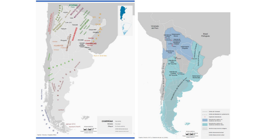En los próximos 50 años se inicia la ocupación territorial de lo que será Argentina, pero con distintas corrientes inmigratorias que al día de hoy conforman aún identidades culturales del país6 (norte grande, cuyana, rioplatense y litoraleña, Fig. 1). Así con las fundaciones de las primigenias ciudades argentinas comienza la historia de ocupación de un territorio hostil al conquistador en su mayor porción. Ya que a diferencia del resto del Virreinato del Perú la influencia de los Incas sólo se limita al sector noreste del actual territorio argentino y hacia el sur se encontraron “un desierto inhóspito” la pampa. Según los autores Brailovsky y Foguelman5 , la densidad poblacional en el territorio de llanuras argentinas era bajo producto de un proceso multicausal de incendios y depredación humana de las faunas que podían aportar alimentos a pueblos nómades cazadores5 . Estos pueblos (Fig. 2) tenían una posición aguerrida y se desplazaban en un área de 52 millones de hectáreas y representaron un obstáculo para el control del territorio por los conquistadores que no hicieron nada por poblarla y explotar sus recursos naturales5 . Hacia el 1600 parte del territorio actual argentino dependía de la gobernación de Charcas del Virreinato del Perú 7 .