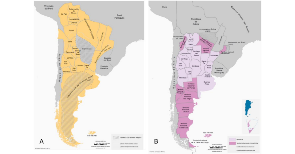 Figura 4. A) Provincias Unidas del Río de la Plata (1820-1825) y B) República Argentina 1884-19436