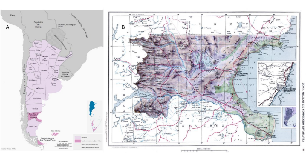 Figura 5. A) República Argentina 1943-19546 ; B) Mapa de la Gobernación Militar de Comodoro Rivadavia en el Atlas de la República Argentina editado por el Instituto Geográfico Militar y el Ejército Argentino, primera edición año 1953.
