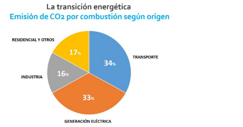 El gráfico muestra cómo el transporte (34%) y la generación eléctrica (33%) concentran la mayor parte de las emisiones de CO2 por combustión. La industria (16%) y el sector residencial y otros usos (17%) completan el panorama, evidenciando que la transición energética requiere políticas integrales que aborden tanto la movilidad como la producción eléctrica, sin descuidar el impacto de los hogares y la actividad industrial.